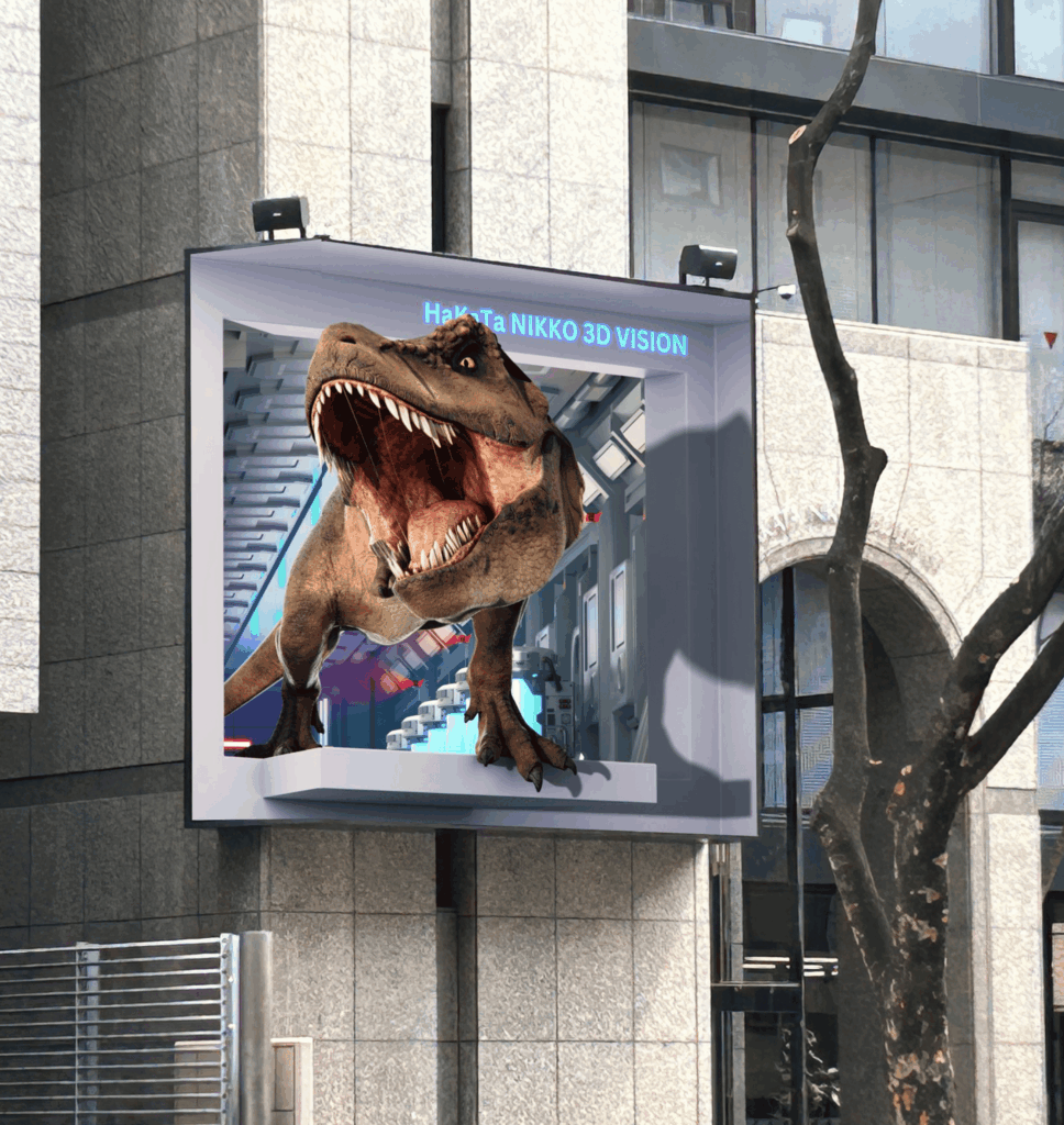 「博多日光3Dビジョン」博多初となるへの字型2LEDビジョンによる3D(立体)映像を提供、オリジナル3Dコンテンツを制作中です。